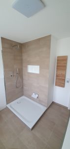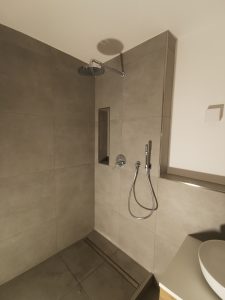 Komplette Badgestaltung mit hochwertigen Armaturen und bodengleicher Dusche.